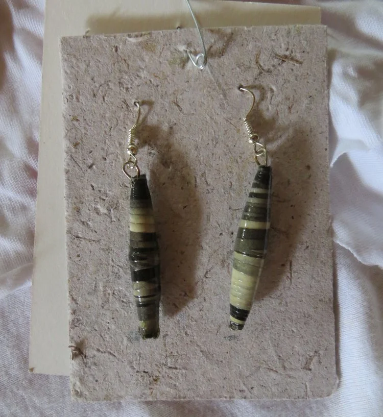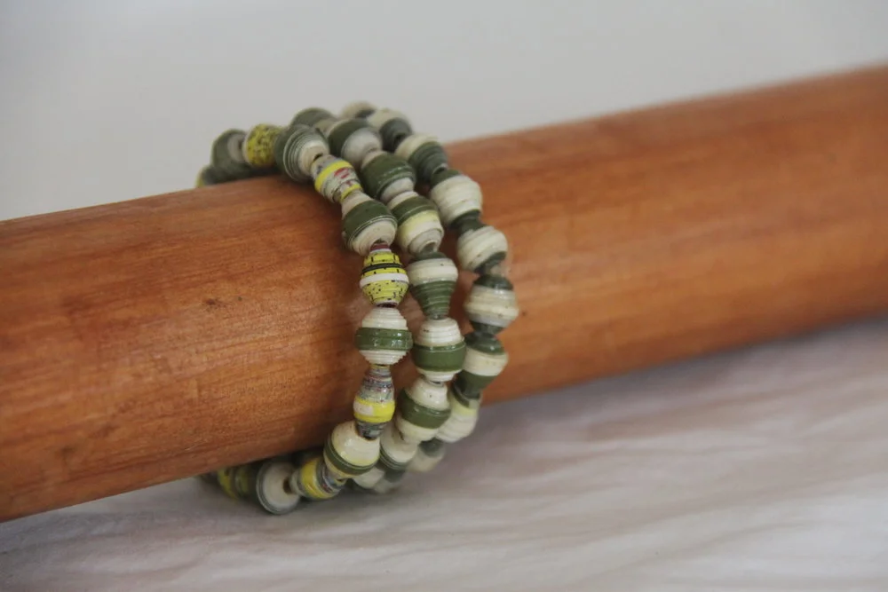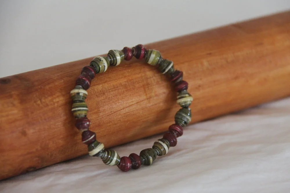 From colourful used magazines the Neema Women’s Group makes paper beads. They cut and roll pages taken from the magazines before varnishing them to create beautiful and unique end products. Most popular are the single strand paper bead elastic bracelets and the paper bead earrings.